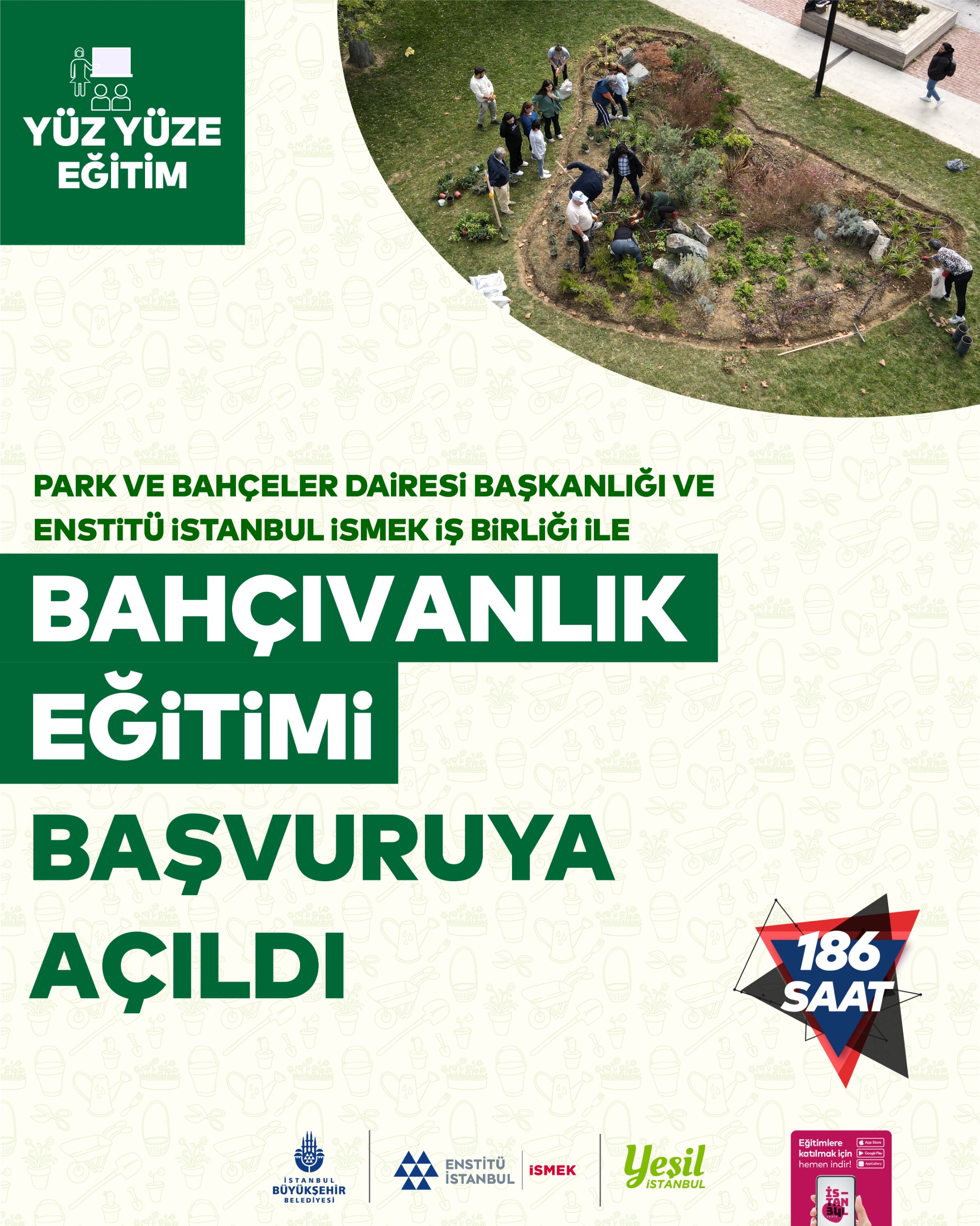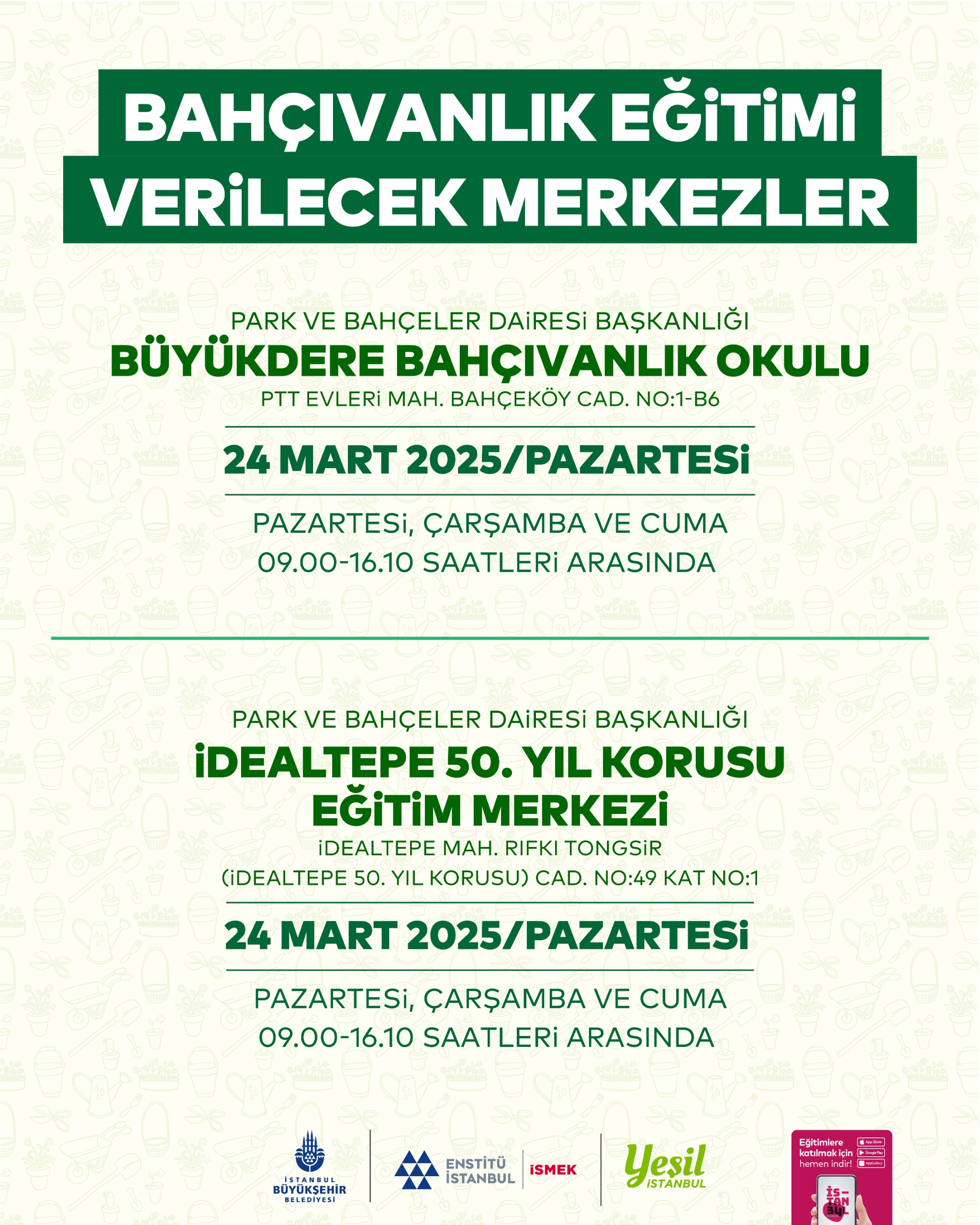 Her yıl Güz ve Bahar Dönemi olmak üzere düzenli aralıklarla yapılan Bahçıvanlık Eğitim Programı bu sene 24.03.2025 - 30.05.2025 tarihleri arasında İdealtepe 50.Yıl Korusu Eğitim Merkezi’nde ve Büyükdere Atatürk Fidanlığı Bahçıvanlık Okulu’nda gerçekleştirilecek. Her iki mekanda da eş zamanlı olarak verilecek eğitimlere yeni dönem katılımcılarını belirlemek için 12.03.2025 - 19.03.2025 tarihleri arasında başvurular alınacak. 50 asil ve 20 yedek kontenjanı bulunan eğitime katılmak için 18 yaşını doldurmuş olmak, TC vatandaşı olmak ve okuma-yazma bilmek gerekiyor.