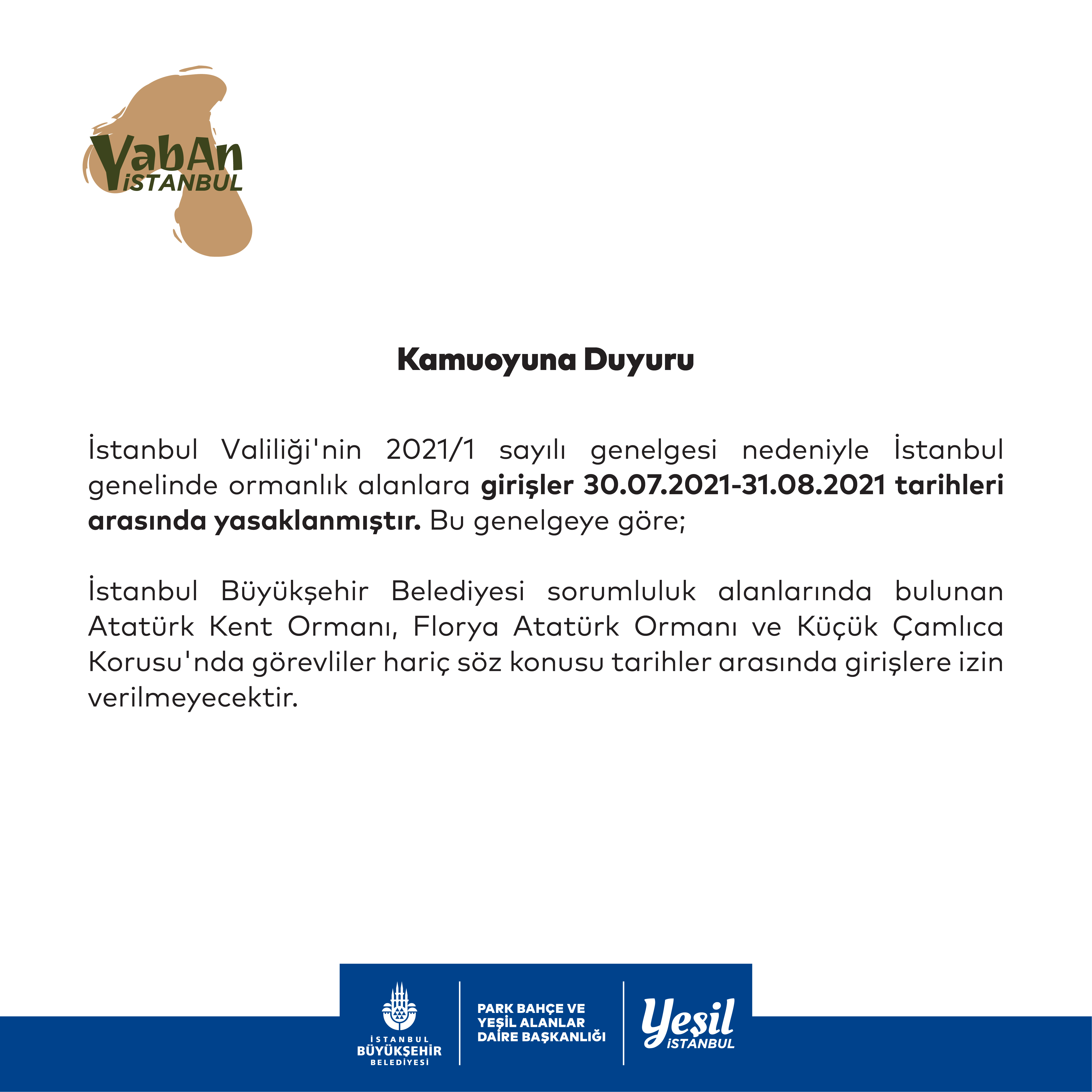 İstanbul Büyükşehir Belediyesi sorumluluk alanlarında bulunan; Sarıyer Atatürk Kent Ormanı, Florya Atatürk Ormanı ve Küçük Çamlıca Korusu'nda görevliler hariç söz konusu tarihler arasında girişlere izin verilmeyecektir.