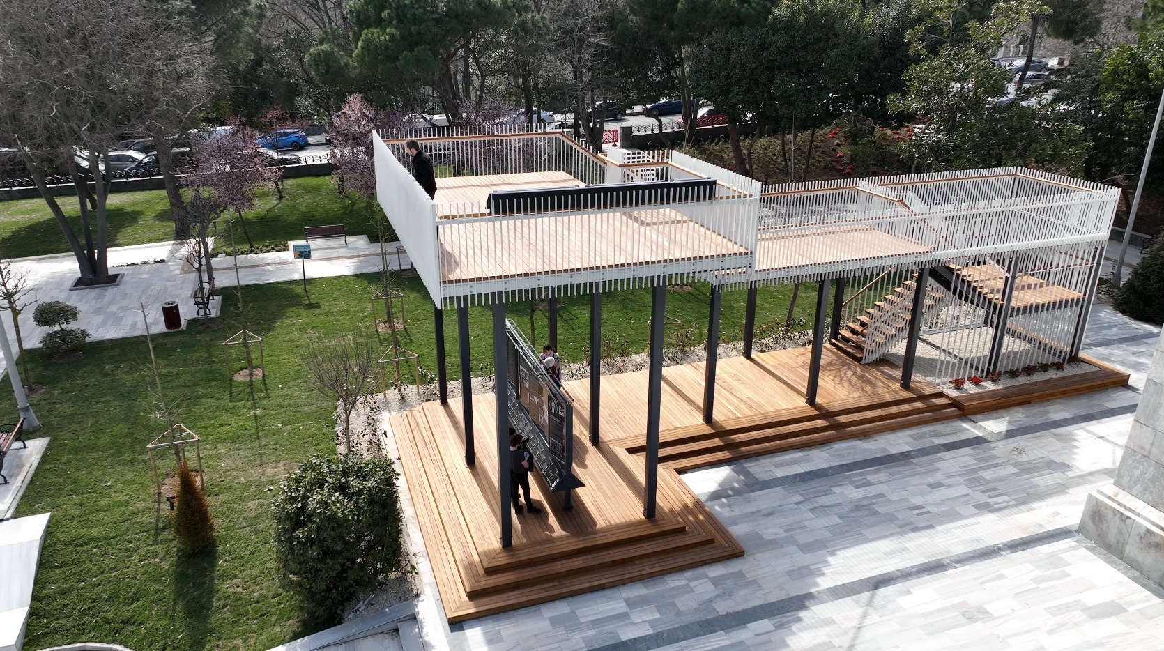 Geçici sergi strüktürü fikriyle parkın genel dokusuna zarar vermeyecek şekilde, ek bir betonarme temel oluşturmamak amacıyla çelik strüktür tercih edilmiş, ahşap döşeme malzemeleri kullanılarak parkın doğal ve sıcak dokusuna uygun bir yapı tasarlanmaya çalışılmıştır. Önerilen strüktür, parkın mevcut yaya sirkülasyonunu engellemeyecek ve mevcut yoğun ağaç dokusuna zarar vermeyecek biçimde konumlandırılmıştır.